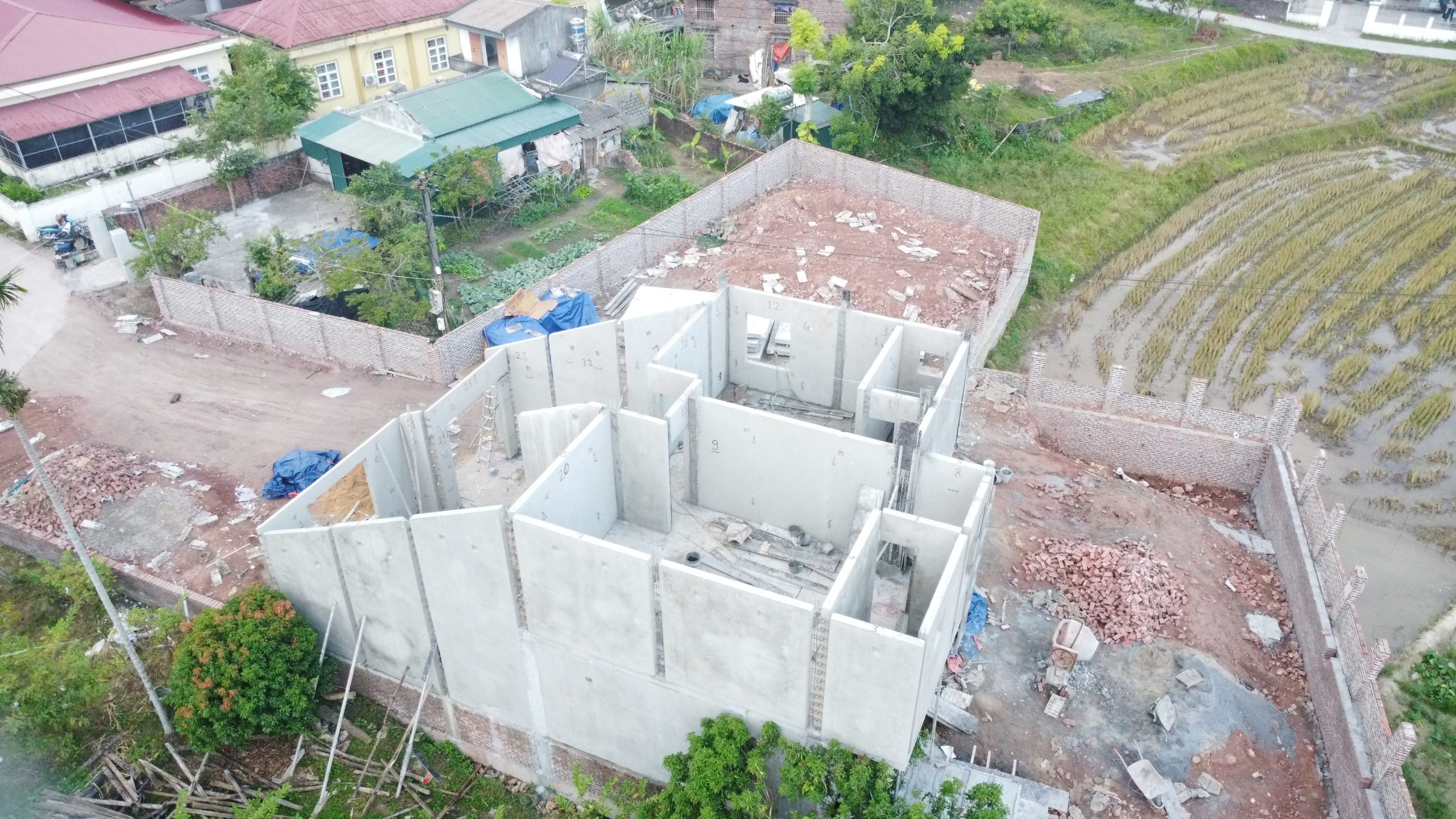 Chính cấu trúc tường vát chéo này đóng vai trò là kết cấu mái, giúp loại bỏ nhiều hạng mục mái truyền thống, đồng thời tăng khả năng thoát nước mưa và giảm tải trọng tổng thể. Ưu điểm nổi bật của giải pháp này là sự liền mạch giữa tường và mái, tạo nên một khối kiến trúc thống nhất, chắc chắn và có tính thẩm mỹ cao. Bên cạnh đó, tấm tường bê tông đúc sẵn còn mang lại khả năng cách âm, cách nhiệt tốt, giúp không gian bên trong biệt thự luôn yên tĩnh và mát mẻ, phù hợp cho nhu cầu nghỉ dưỡng và sinh hoạt lâu dài. Nhờ phương pháp lắp ghép, toàn bộ quá trình thi công phần thô của biệt thự 2 tầng diễn ra nhanh chóng, giảm đáng kể thời gian và nhân công so với xây dựng truyền thống, đồng thời hạn chế ảnh hưởng của thời tiết đến tiến độ công trình. Công nghệ lắp ghép tấm tường bê tông đúc sẵn với thiết kế vát chéo làm mái tại Đầm Hà không chỉ cho thấy khả năng đáp ứng linh hoạt các ý tưởng kiến trúc phức tạp mà còn khẳng định đây là giải pháp xây dựng hiện đại, bền vững và hiệu quả, phù hợp với xu hướng phát triển các công trình biệt thự chất lượng cao trong tương lai.