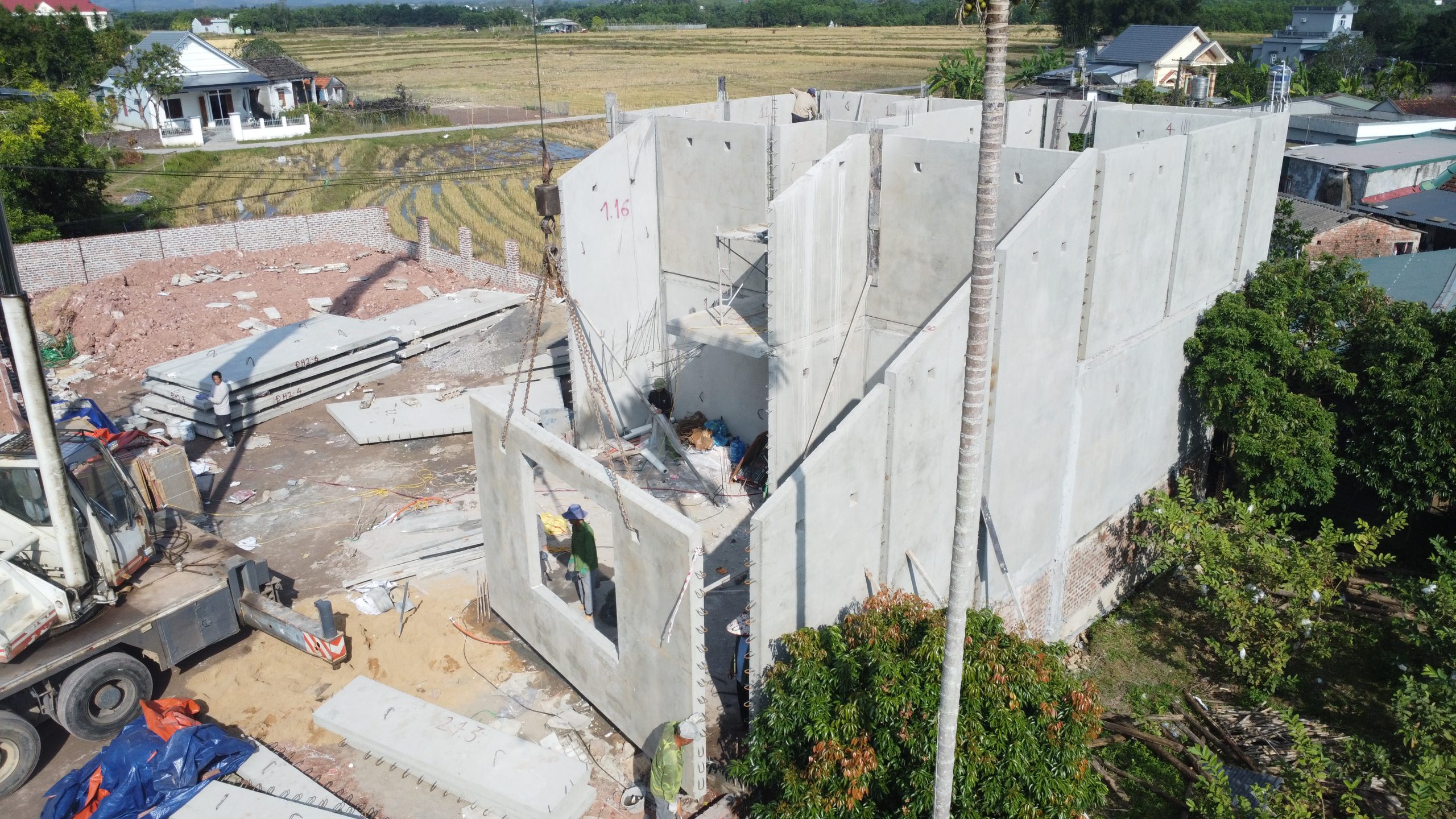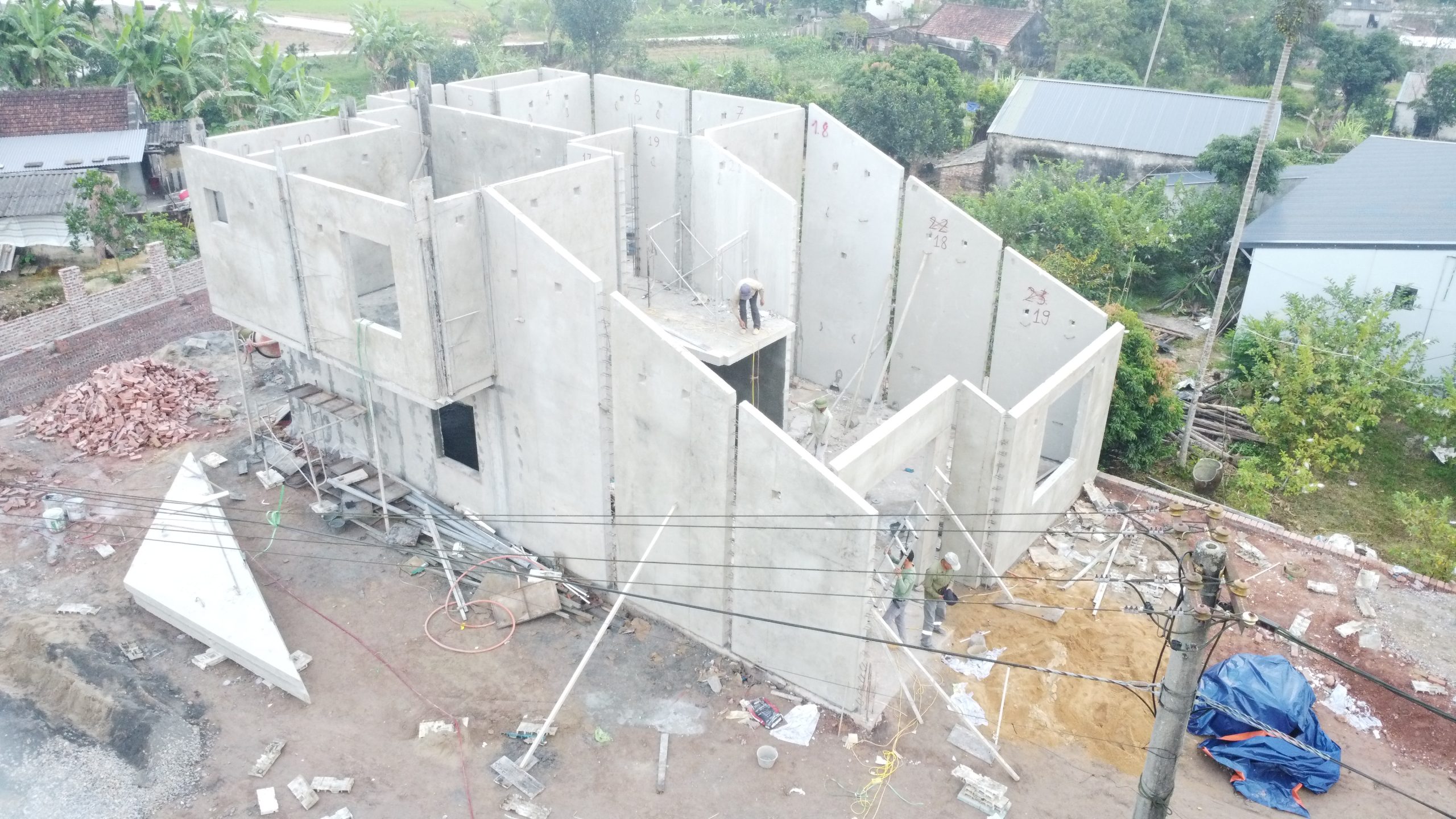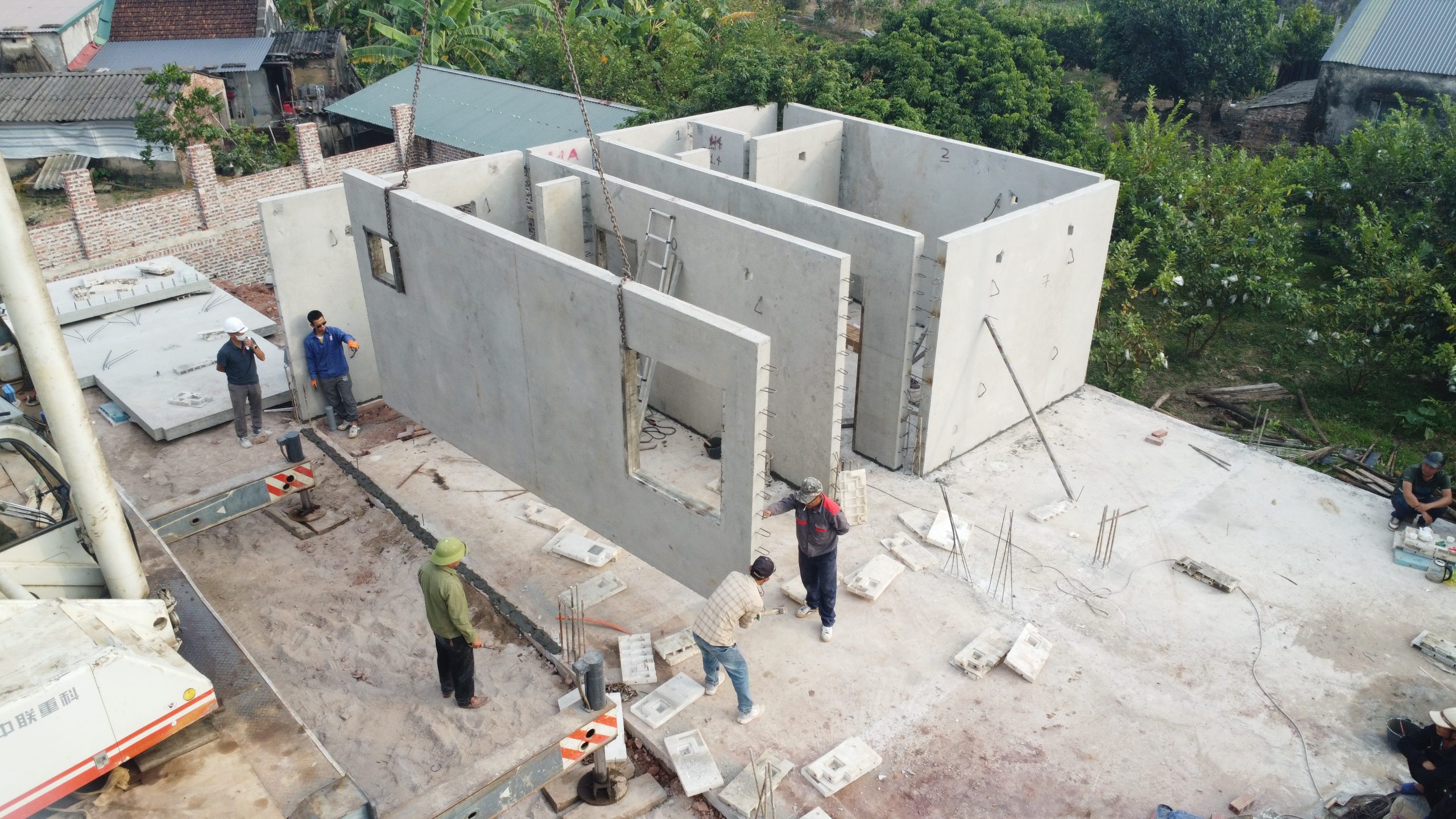 Công nghệ lắp ghép tấm tường bê tông đúc sẵn đang ngày càng chứng minh tính linh hoạt và khả năng đáp ứng cao đối với những công trình có yêu cầu thiết kế đặc thù, trong đó tiêu biểu là công trình biệt thự 2 tầng tại Đầm Hà với kiến trúc mái chéo độc đáo.