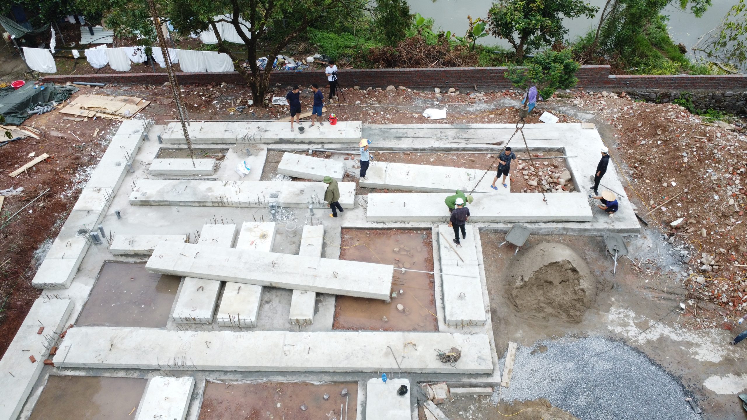 Giai đoạn đầu tiên của quá trình thi công là lắp ghép các module móng đúc sẵn. Khác với phương pháp truyền thống phải đào, buộc thép, ghép cốp pha và chờ bê tông khô, công nghệ mới sử dụng các khối móng được sản xuất sẵn với kích thước và vị trí liên kết chính xác tuyệt đối. Tại công trường, đội ngũ kỹ thuật tiến hành khảo sát, định vị và hạ đặt từng module móng bằng hệ thống cẩu chuyên dụng. Các khớp nối giữa các khối móng được xử lý bằng keo kết cấu và vữa chuyên dụng, tạo thành nền tảng vững chắc cho toàn bộ ngôi nhà. Nhờ công nghệ này, giai đoạn móng chỉ mất vài ngày để hoàn thiện thay vì kéo dài hàng tuần như trước, đồng thời giảm thiểu sai số và rủi ro trong thi công. Sau khi hệ móng ổn định, quá trình lắp ghép tầng 1 được triển khai.