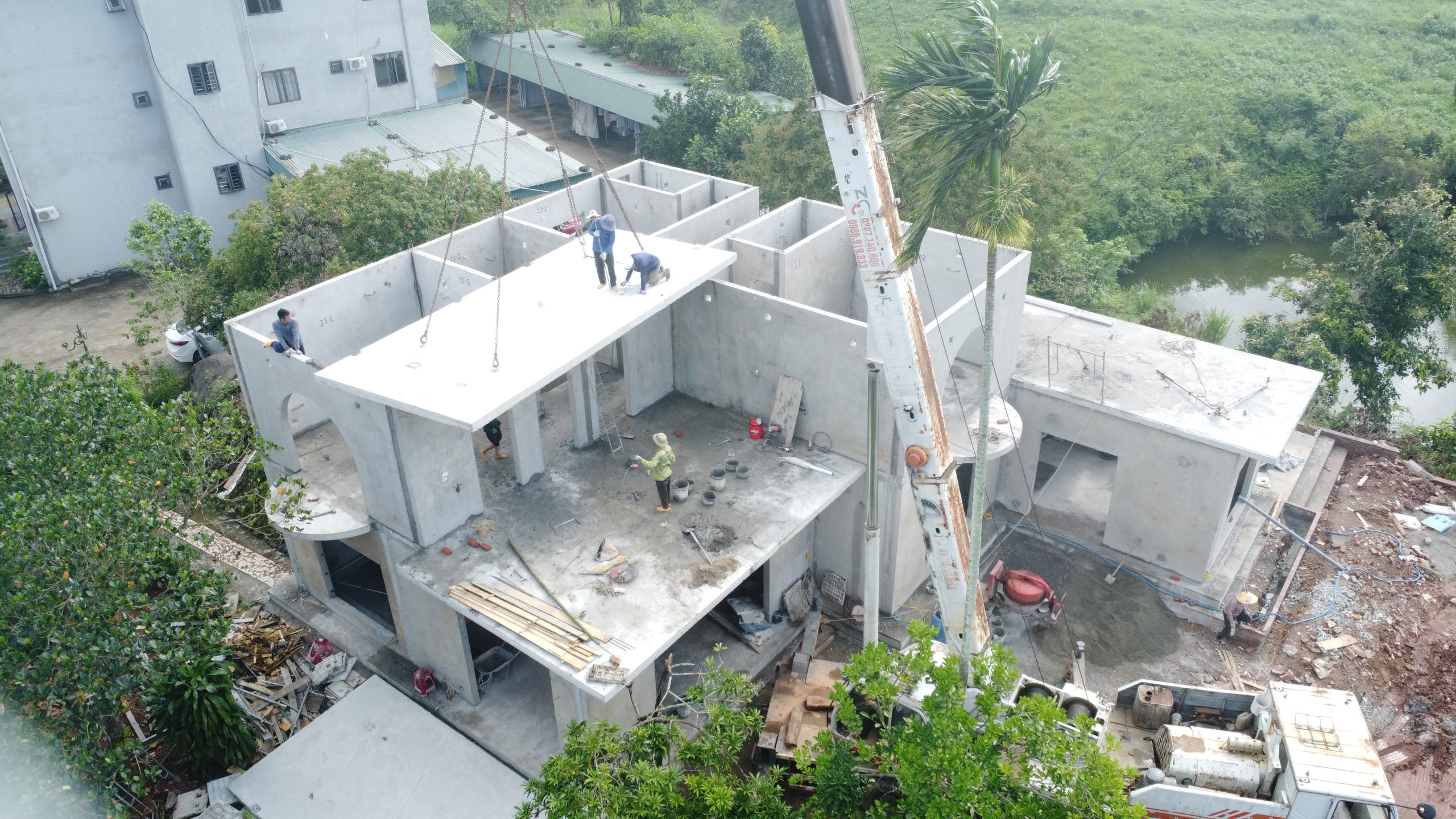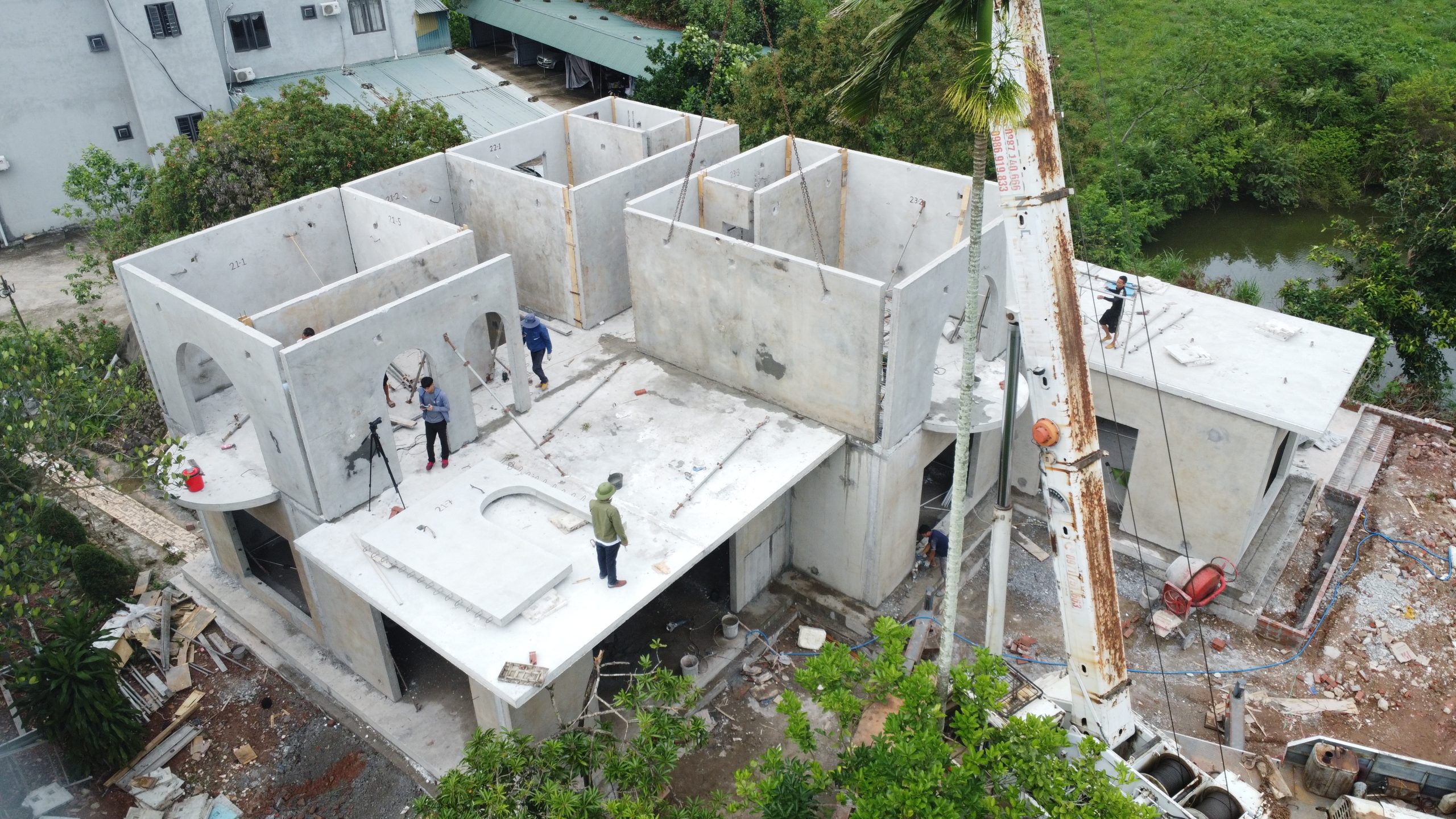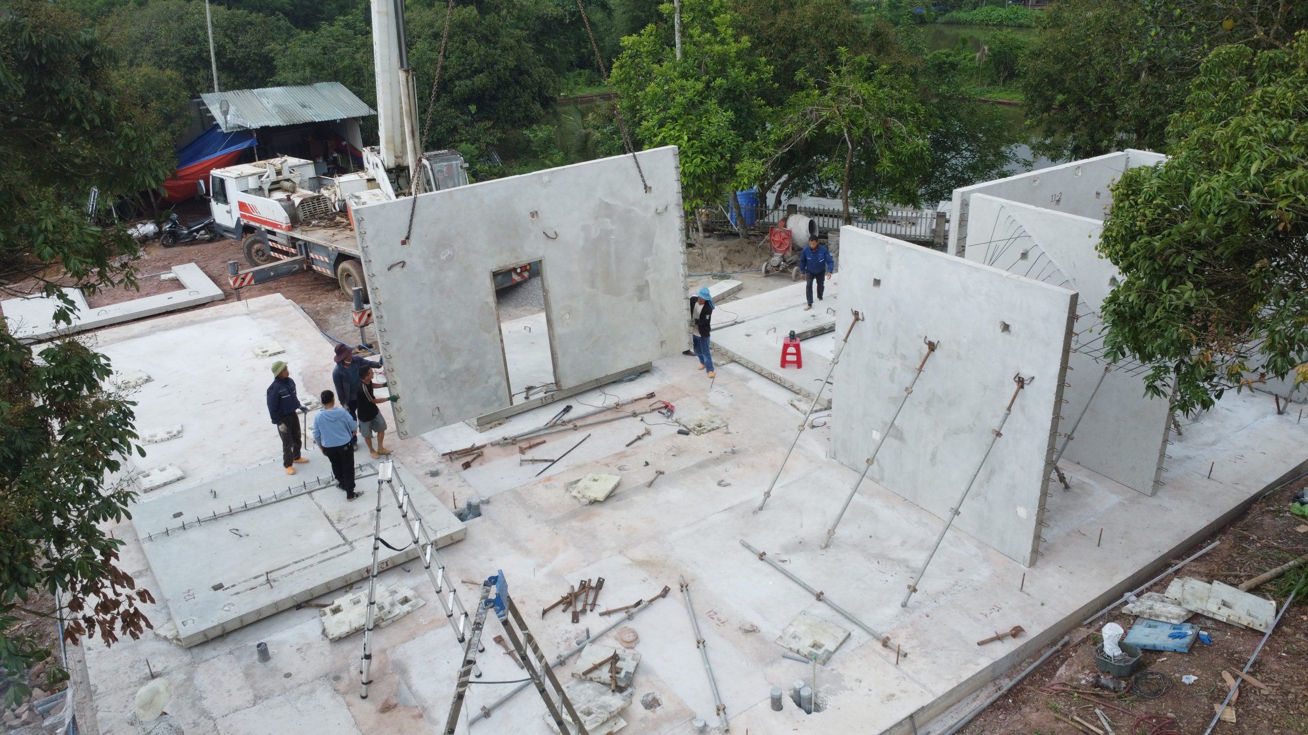 Công nghệ xây dựng nhà lắp ghép bê tông đúc sẵn đang mở ra một kỷ nguyên mới cho ngành xây dựng hiện đại, đặc biệt với phiên bản cải tiến V2 được ứng dụng trong nhiều loại công trình dân dụng và biệt thự cao cấp. Tại Hải Hà, một dự án biệt thự hai tầng vừa được hoàn thiện theo công nghệ này, sử dụng hệ tấm tường bê tông đúc sẵn V2 với quy trình lắp ghép khoa học, chính xác và hiệu quả. Toàn bộ công trình được thi công theo mô hình module, trong đó các cấu kiện chính như móng, tường, sàn đều được đúc sẵn tại nhà máy và vận chuyển đến công trường để lắp đặt, đảm bảo chất lượng đồng nhất và tiến độ vượt trội.