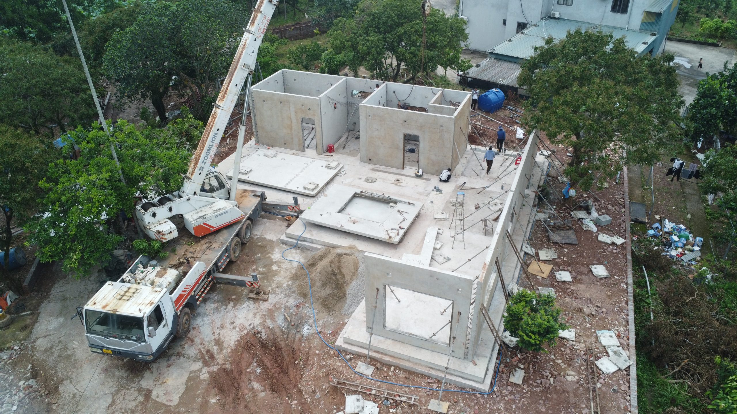 Những tấm tường bê tông đúc sẵn V2 có kích thước to bản được vận chuyển đến công trình, sắp xếp theo thứ tự và vị trí được xác định trong bản vẽ thiết kế. Mỗi tấm tường đều có sẵn các rãnh ngàm và lỗ chờ giúp việc liên kết giữa các tấm trở nên nhanh chóng và chính xác. Các công nhân chỉ cần sử dụng thiết bị nâng hạ, đưa tấm tường vào đúng vị trí, kiểm tra độ thẳng đứng và cố định bằng bulông, chốt thép cùng lớp keo kết dính đặc chủng. Cấu trúc tường V2 không cần khung dầm chịu lực mà chính bản thân các tấm tường đóng vai trò kết cấu chính của công trình, giúp giảm đáng kể khối lượng vật liệu và rút ngắn thời gian thi công mà vẫn đảm bảo độ bền cao. Khi hệ tường tầng 1 đã được lắp đặt hoàn chỉnh, đội thi công tiến hành đặt tấm sàn tầng 1.