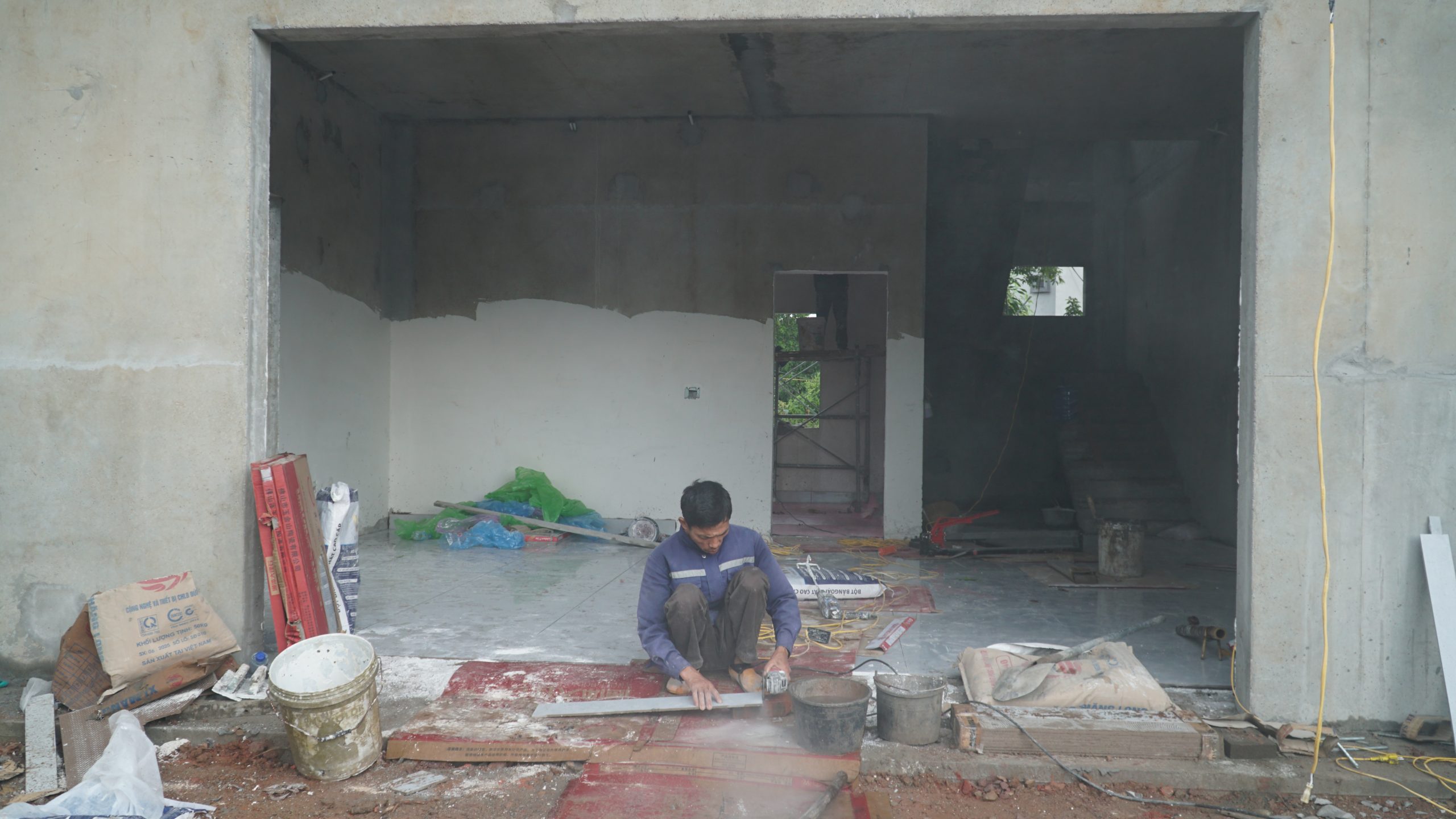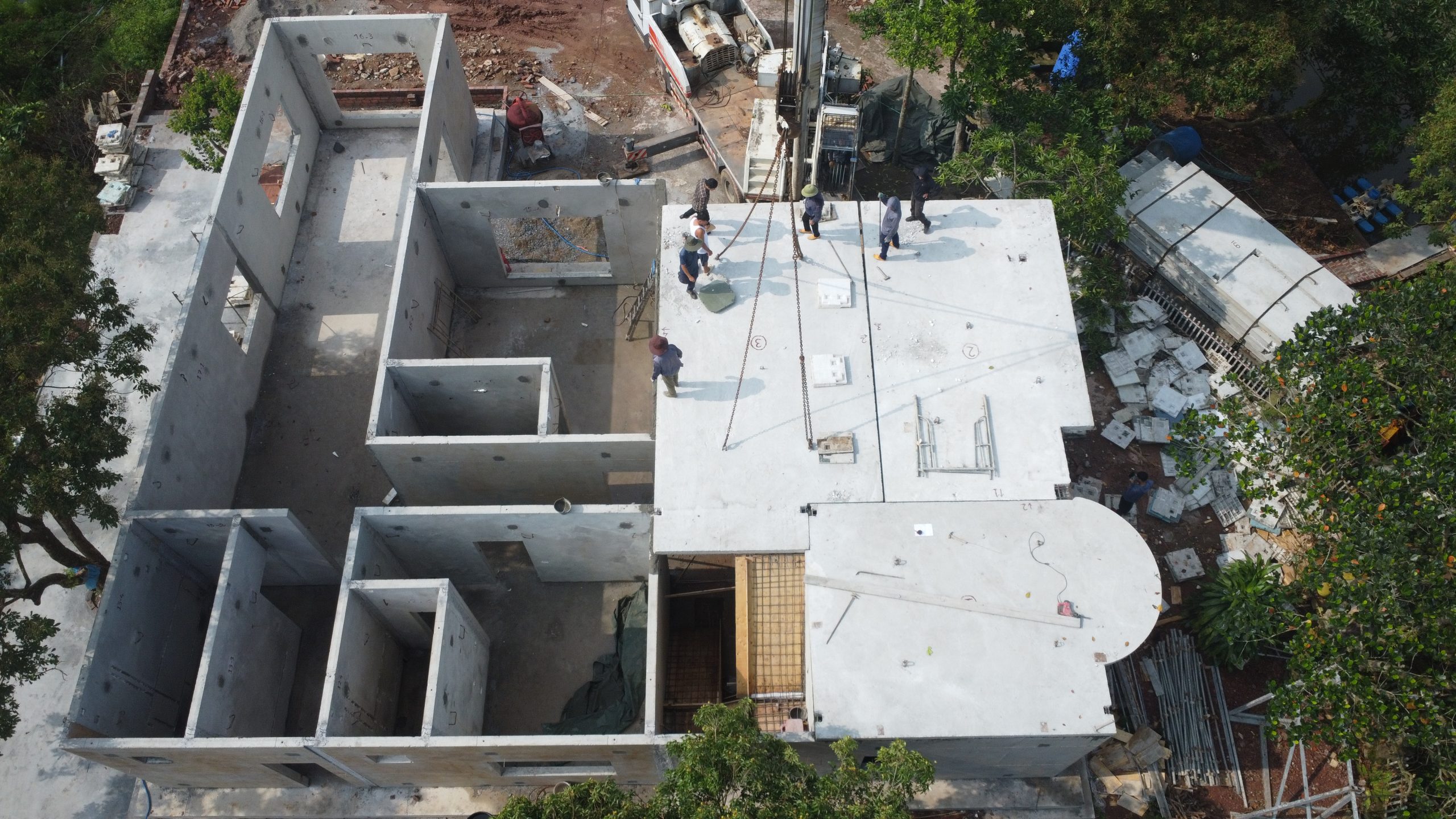 Tiếp đến là bước ghép tường tầng 2 – giai đoạn tiếp tục khẳng định ưu thế vượt trội của công nghệ V2. Các tấm tường được lắp tương tự như tầng 1, với hệ ngàm kết nối đồng bộ giúp công trình đảm bảo tính ổn định, chống rung và chịu tải trọng tốt. Nhờ việc sản xuất bằng khuôn công nghiệp chính xác, các bề mặt tường phẳng tuyệt đối, giúp giảm thiểu công đoạn trát và hoàn thiện, đồng thời tăng tính thẩm mỹ cho tổng thể biệt thự. Các khoảng chờ kỹ thuật như đường điện, nước, ống thông gió đều được bố trí sẵn trong tấm tường, giúp giai đoạn hoàn thiện diễn ra nhanh và gọn hơn rất nhiều so với cách thi công truyền thống.
